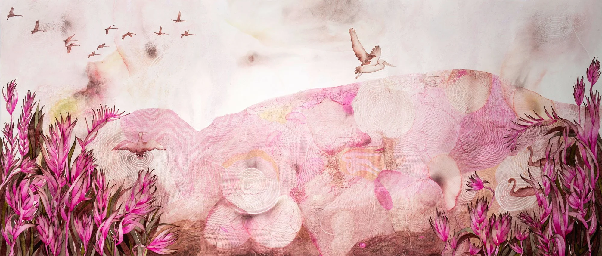 Watercolour on six panels of paper, H 61cm x W 137cm